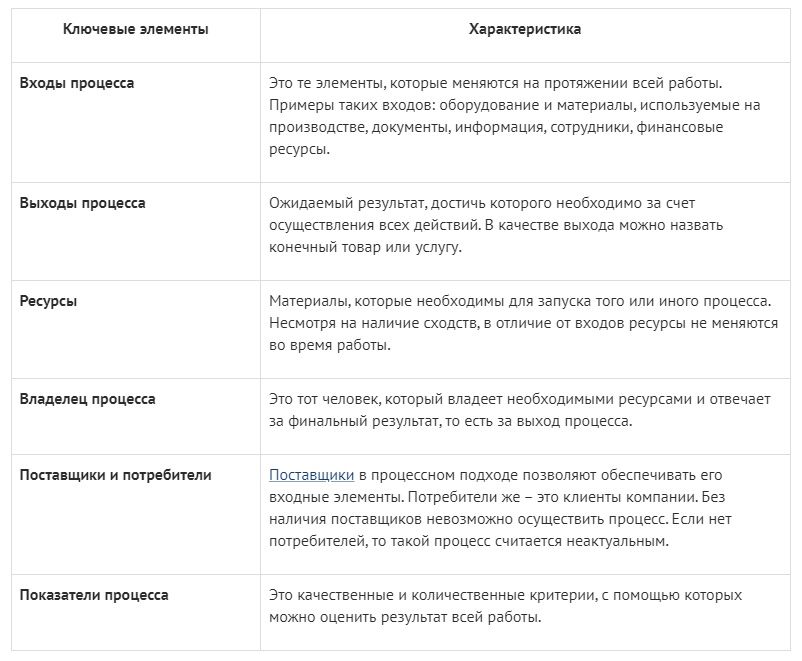 Процессный подход к управлению организацией подразумевает использование следующих ключевых элементов: