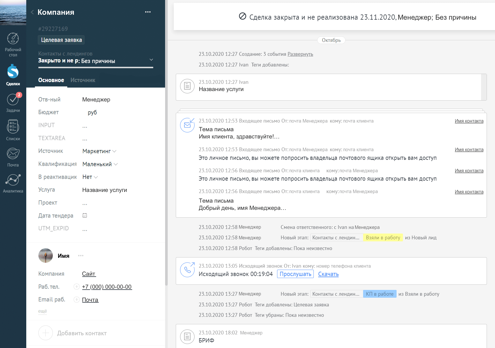 Вся история взаимоотношений с клиентом фиксируется: телефонные звонки, которые вы можете прослушать в записи, отправленные сообщения по почте и в мессенджерах, личные встречи, этапы транзакций, когда покупка была завершена успешно, а когда нет.