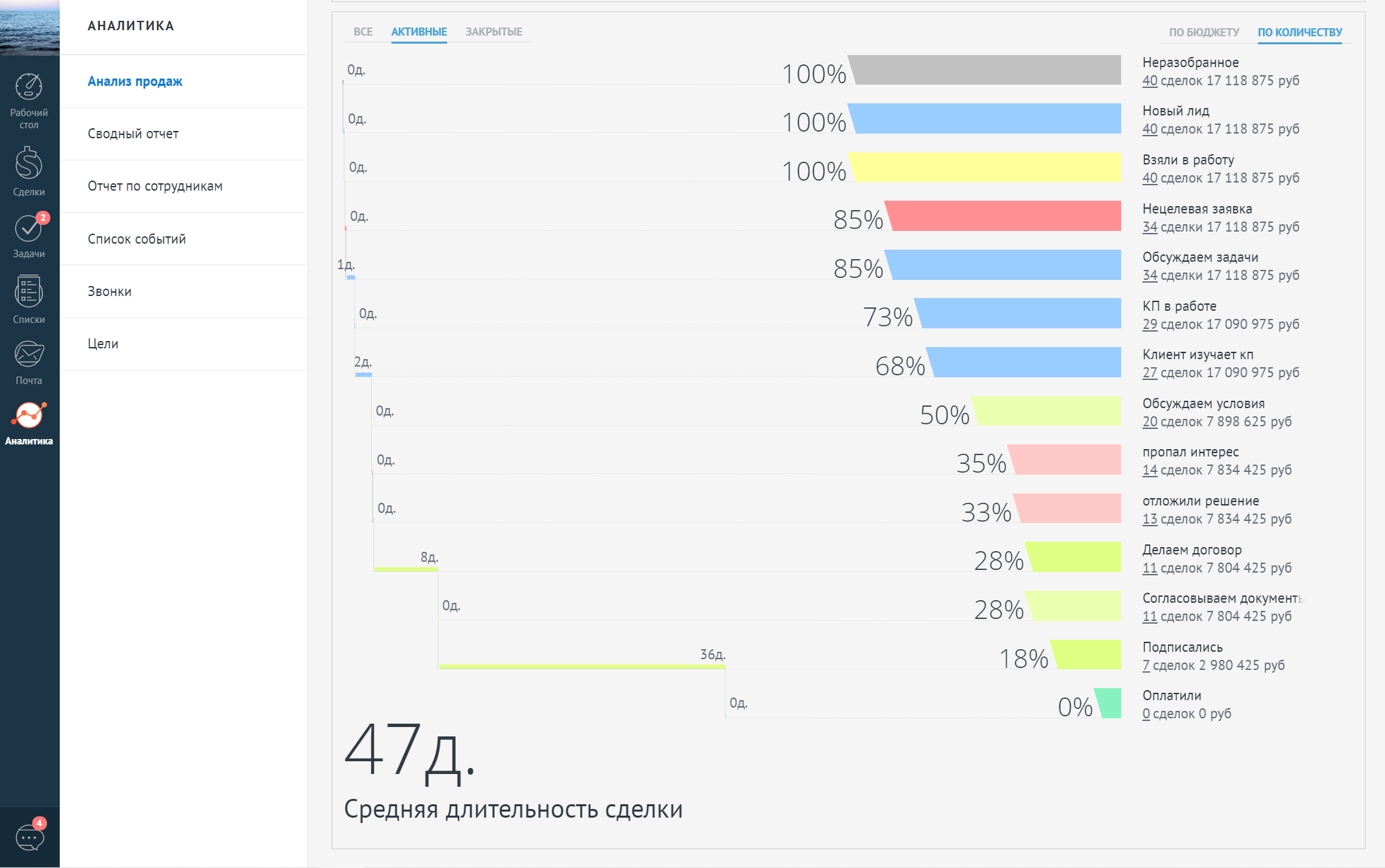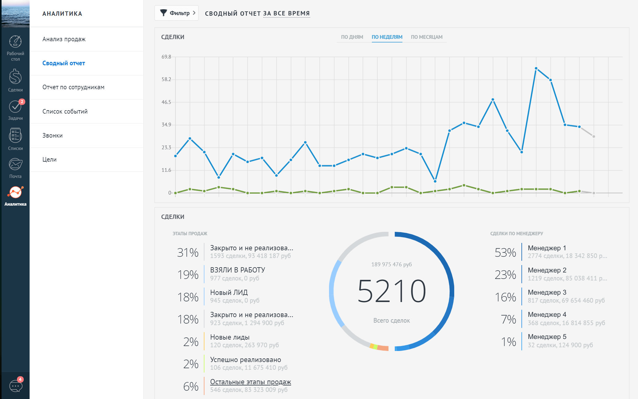 Помогает оценивать результаты. CRM собирает всю информацию по сделкам в отчёты. Надо только задать параметры (количество лидов, звонков, сделок и на какую сумму) и период — отчёты появится у вас автоматически.
