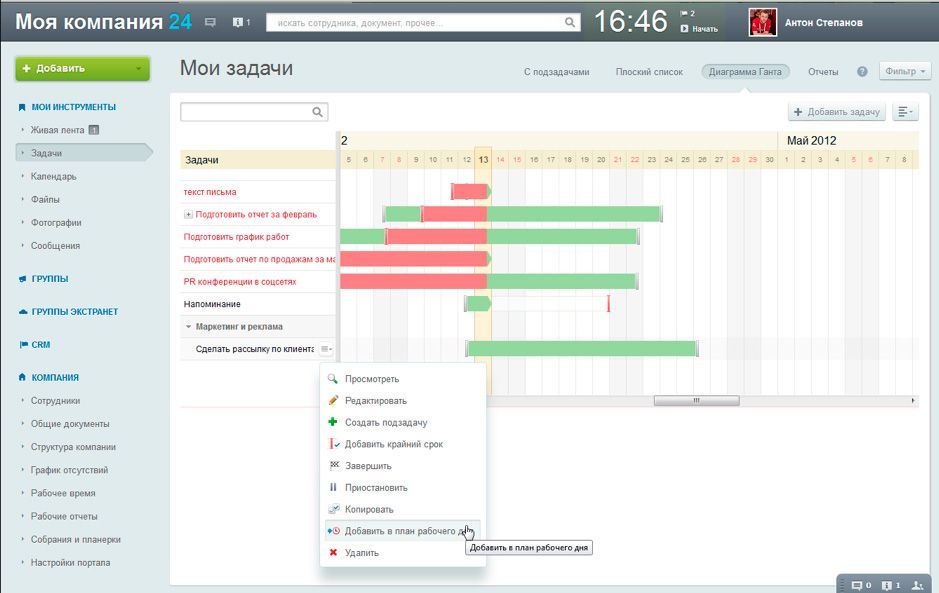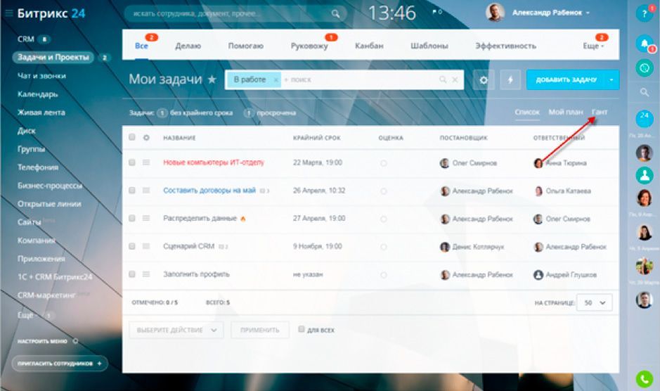 В системе «Битрикс24» есть несколько методик постановки задач — список, «Мой план», диаграмма Ганта.
