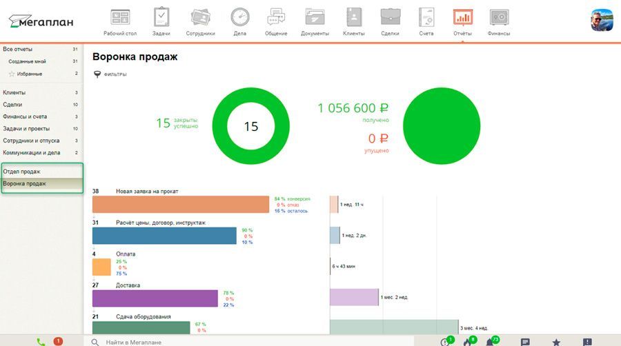 В системе «Мегаплан» можно посмотреть отчеты о том, какие шаги в воронке продаж приносят максимальную конверсию и на какие суммы. Похожие инструменты предлагают и другие вендоры.