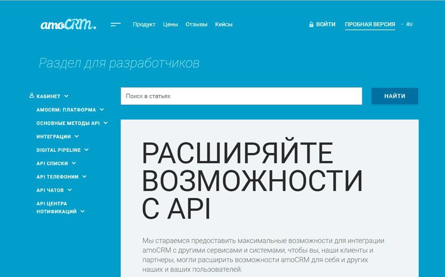На сайте amoCRM один из самых обширных разделов адресован именно разработчикам