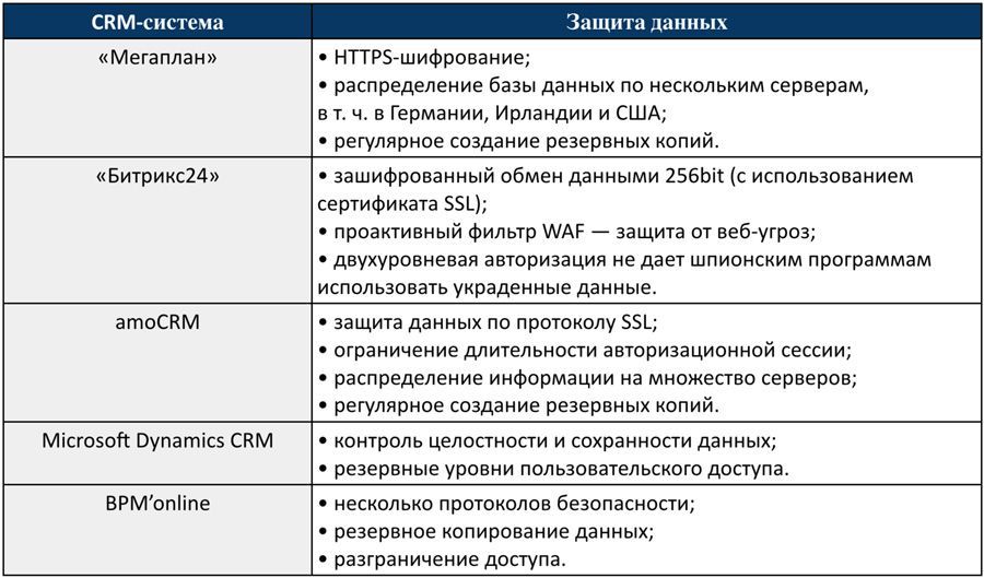 Коробочные решения хранятся на сервере компании и гарантируют сохранность данных. В чистом виде «коробка» встречается редко, чаще платформы поддерживают хранение информации как в «облаке», так и на сервере — «Битрикс24», «Мегаплан», Bpm’online, Microsoft Dynamics CRM.