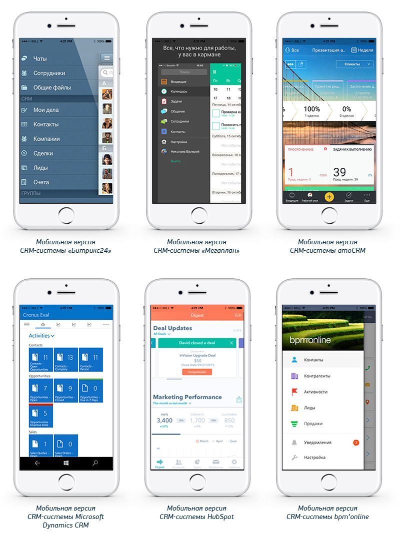 Мобильные версии для устройств на базе iOS и Android имеют CRM-системы «Битрикс24», «Мегаплан», amoCRM, Microsoft Dynamics CRM, HubSpot и bpm’online.