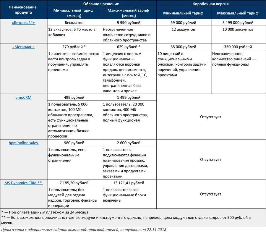 Количество пользователей — важный критерий при выборе между коробочной и облачной версией. Цены облачных и коробочных версий одной системы отличаются.