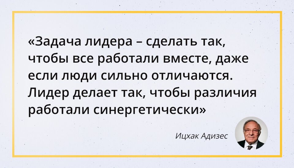 Ицхак Адизес показывает лидера на примере руки человека. Все пять пальцев необходимы и каждый из них выполняет свою важную функцию. Некоторые считают, что лидерство – это указательный палец. Однако такое лидерство необходимо в начале становления организации и в период кризисных моментов. На самом деле лидер – это большой палец руки. Именно он взаимодействует со всеми пальцами руки и обеспечивает ей полноценную работу.