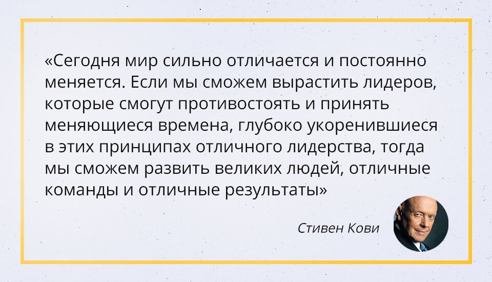 Одним из важных атрибутов лидера является ориентация на универсальные и вечные принципы, которые являются своеобразным компасом для дальнейших действий и решений. Эти принципы очевидны, на их основе строятся великие философии, они являются фундаментом: это такие ценности, как честность, сострадание, доверие и так далее. Если сделать эти черты привычками и следовать им, у человека меняется характер и формируется моральный авторитет, необходимый для лидерства.