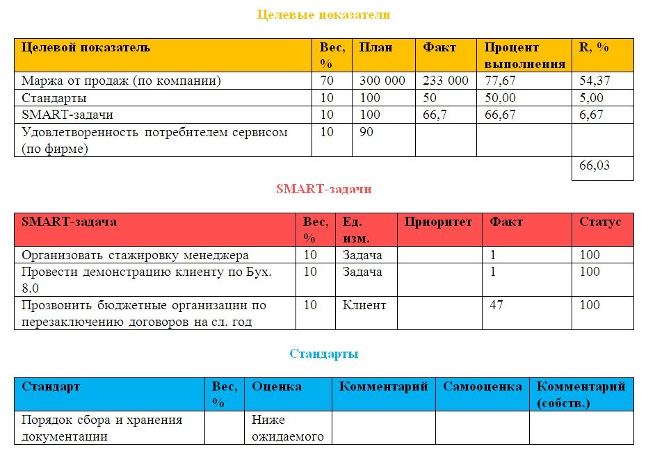 Таким образом, мы получаем объективный показатель эффективности сотрудника — рассчитанный математически коэффициент на основе запланированных целевых ориентиров, которые были известны сотруднику заранее, и к которым он был готов психологически. Это своего рода мини-контракт, который руководитель ежемесячно/ежеквартально заключает со своими сотрудниками о достижении определенных результатов. При достижении обозначенных показателей, сотрудник будет вознагражден, при значительном недовыполнении — может стать вопрос об увольнении. К тому же, в меняющейся ситуации на рынке можно легко убирать и добавлять показатели, менять размер целевых значений, веса между ними. Это позволит компании быть гораздо более динамичной и управляемой. Кроме того, сотрудники будут внимательно следить за тем набором показателей, который будет лежать в основе расчета их финансового бонуса и выстраивать свои действия для получения максимального результата.