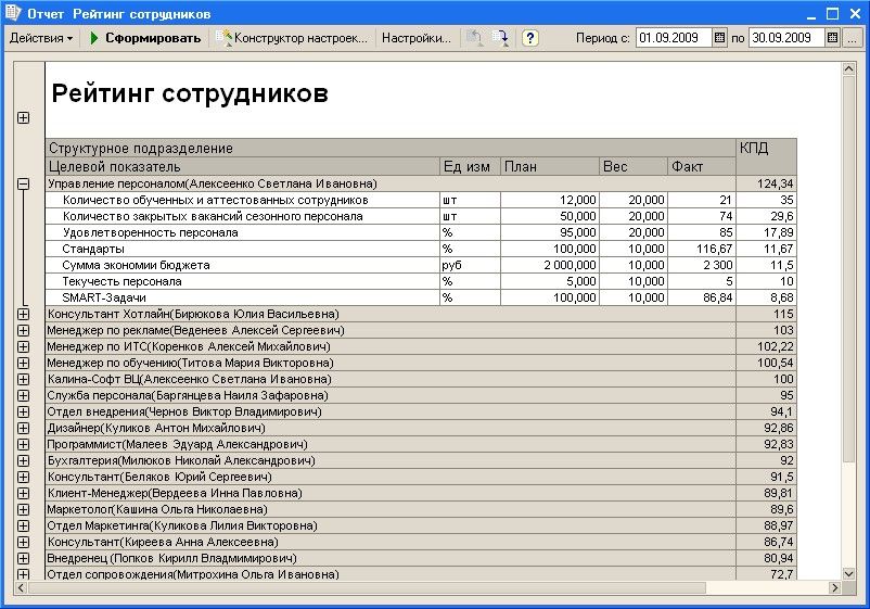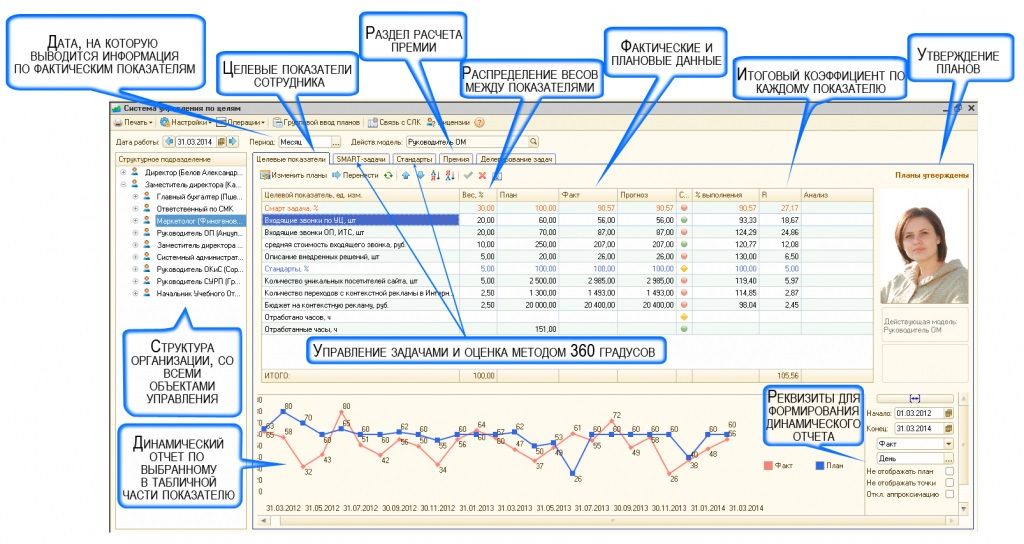 На приведенном рисунке видно как можно с использованием автоматизированной системы собирать, хранить и анализировать показатели. С левой стороны представлен иерархический список сотрудников предприятия в привязке к организационной структуре. С помощью него можно легко выбирать интересующий объект управления (должность, с назначенным на нее сотрудником) для анализа выполнения показателей. В центральной верхней части на закладках представлены наборы показателей с плановыми и фактическими данными, а в нижней части экрана формируется динамический отчет, с помощью которого можно видеть изменение показателей во времени.