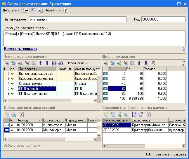 После того, как в системе будут собраны данные по объективным показателям, руководитель или сотрудник, на которого возложена соответствующая функция, проставляет факт выполнения каждой задачи и производит ее оценку по субъективным показателям. В качестве итога по каждому сотруднику рассчитывается в процентах коэффициент его эффективности. На основе заранее определенного алгоритма, рассчитывается размер финансового бонуса. Условием получения бонуса может быть, например, такое правило: «При эффективности менее 60% — отсутствие премии, при эффективности от 60% до 75% размер бонуса будет 50%, а при эффективности более 95% — сотрудник получит бонус размере 100%». Вот как может выглядеть в автоматизированной системе матрица распределения КПД и размера премии для сотрудника бухгалтерии:
