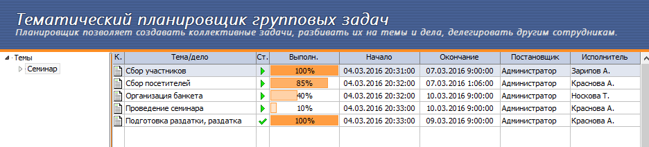 Отчасти мы вдохновлялись именно такими досками, отчасти — диаграммой Гантта, но постарались найти упрощённый и наглядный подход, который будет понятен всем пользователям: от секретаря и телемаркетолога до разработчика и производственника. Ещё один тип планировщиков, который мы используем в RegionSoft CRM — тематический планировщик групповых задач. Это механизм, близкий по сути к диаграмме Гантта, но более удобный именно для коммерческих служб. В одной таблице отображаются этапы работ, состояние, прогресс выполнения, сроки, ответственные. Таким образом, можно планировать загрузку каждого работника на конкретном этапе.