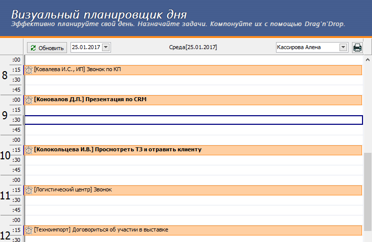 Из трёхнедельного планировщика можно открыть визуальный планировщик дня: в нём содержится информация обо всех задачах, поставленных сотруднику им самим или руководителем. Календарь простой и привычный — задачи создаются прямо в нём, перетаскиваются мышью. В квадратных скобках перед названием задачи отображается клиент, к которому она относится.