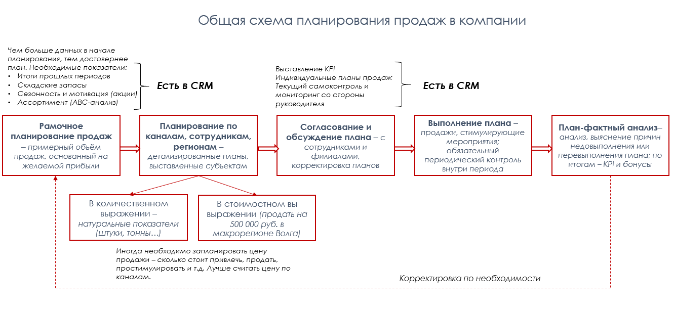 Вот так выглядит примерная схема работы с планом продаж в компании (продавать нужно практически всем, но иногда продажи строятся без плана или план берётся с потолка).