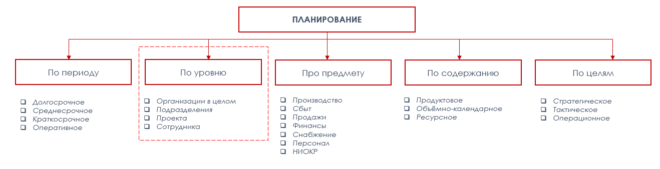 Причём, вопреки канонической классификации планирования по содержанию, целям, предмету, периоду, на первое место выходит классификация по уровню планирования: организация — подразделение — исполняемый проект — сотрудник.