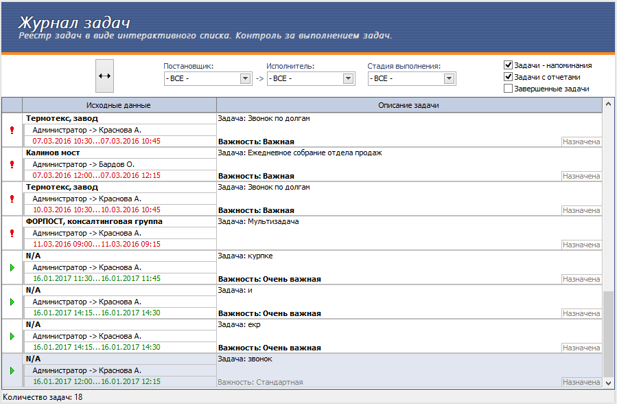 Руководителю и самому сотруднику задачи доступны в визуально удобном реестре, где отображены статусы задачи, важность, сама задача, сроки исполнения. Можно легко отследить невыполненные задачи по каждому сотруднику и постановщику, оценить стадии выполнения задачи. Кстати, подобные группировки в CRM-системах или системах управления проектами экономят время на оценку ситуации, позволяют быстро готовиться к совещаниям и делают прозрачным рабочий процесс.