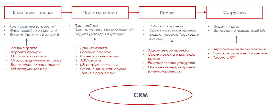 CRM-система на уровне сотрудника и проекта позволяет вести практически все процессы и учитывать максимум данных. При использовании в подразделении или компании в целом, она выполняет функцию источника информации для планирования и прогнозирования наряду с ERP, системой бухгалтерского учёта, внутренним биллингом и т.д. Набор средств автоматизации зависит от сферы деятельности компании и задач управления. Например, строительная компания может легко обойтись связкой CRM+1C, а оператор связи или интернет-провайдер нуждается в биллинговой системе.