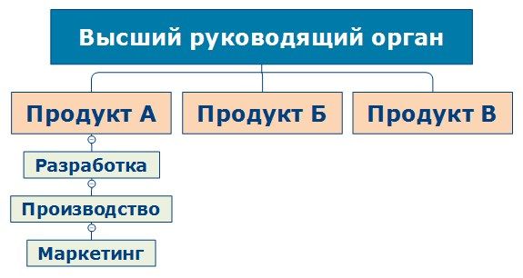 Как и предыдущая, подходит только для крупных компаний. Функции в организации распределяются не по зонам ответственности подчиненных, а по видам продукта, либо по региональной принадлежности дивизиона.