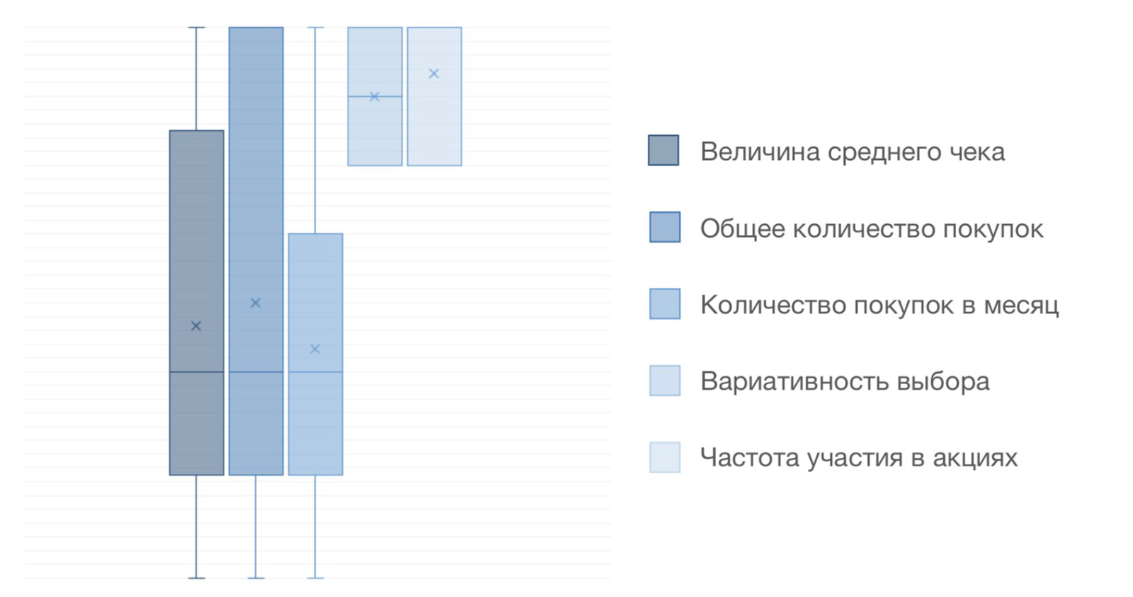 После того, как кластеры сформированы, необходимо понять, по каким параметрам точки в кластерах наиболее схожи, то есть — какие из особенностей поведения пользователей являются систематическими. Один из лайфхаков быстрого их определения — построение боксплотов (ящиков с усами), где значениями выступают показатели каждого клиента по выбранному показателю. Они сразу бросаются в глаза наименьшим размахом значений выборки.