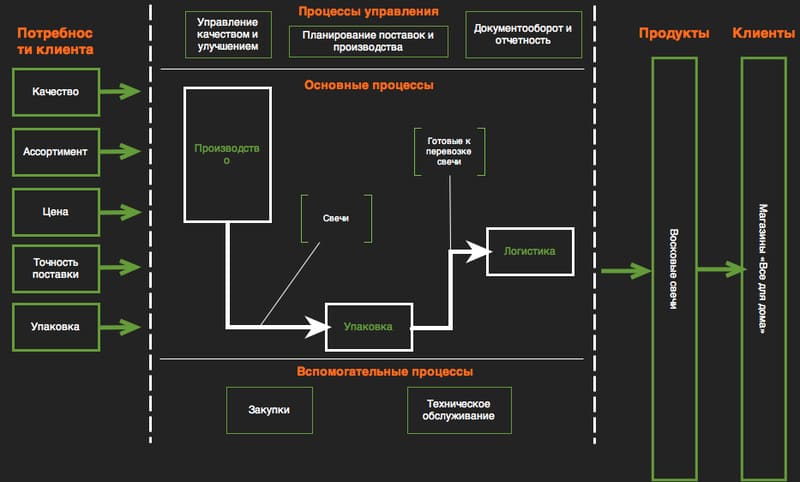 В вашей схеме от одного основного бизнес-процесса к следующему проведите стрелки, на которых будет обозначено, какой продукт стал результатом проведенной операции и перешел на следующий этап. Тогда станут ясны границы каждого их процессов. В рассматриваемом примере производство заканчивается готовым продуктом, это «Свечи», а вот завершение процедуры упаковки дает на выходе «Свечи, готовые к отгрузке».