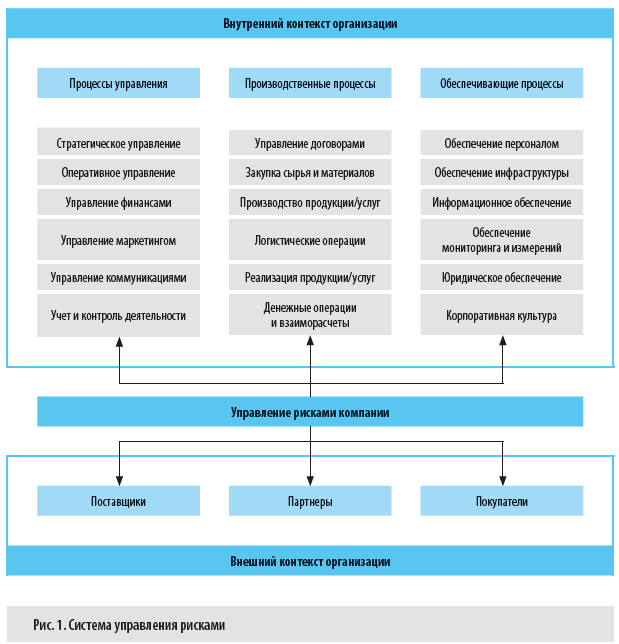 Специфическая особенность данного процесса состоит в том, что он охватывает все без исключения бизнес-процессы компании и реализуется в рамках как внешнего, так и внутреннего контекстов бизнеса (рис. 1).