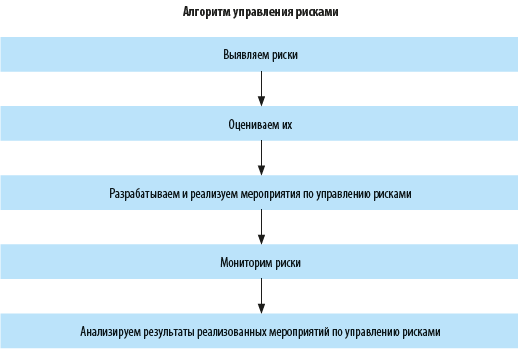 Алгоритм процесса управления рисками представляет собой последовательную цепочку процедур, которые помогают руководству компании эффективно минимизировать угрозы и использовать возможности для достижения целей предприятия (см. схему).
